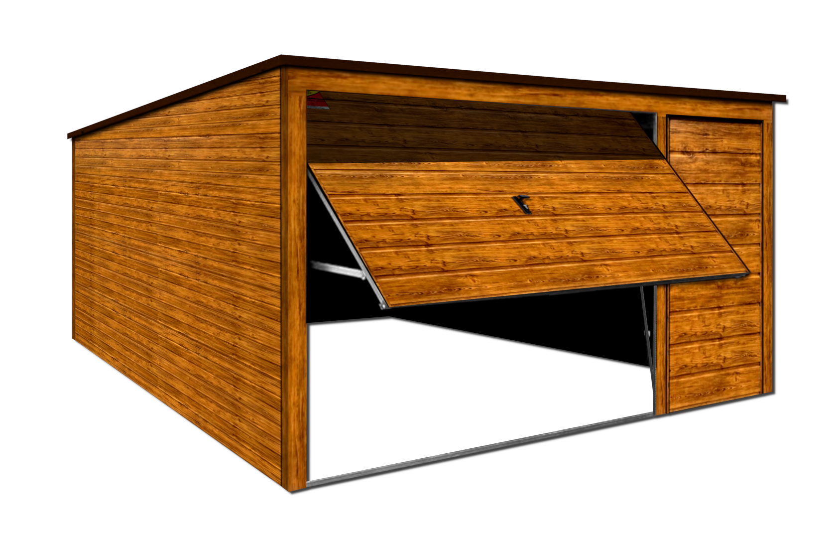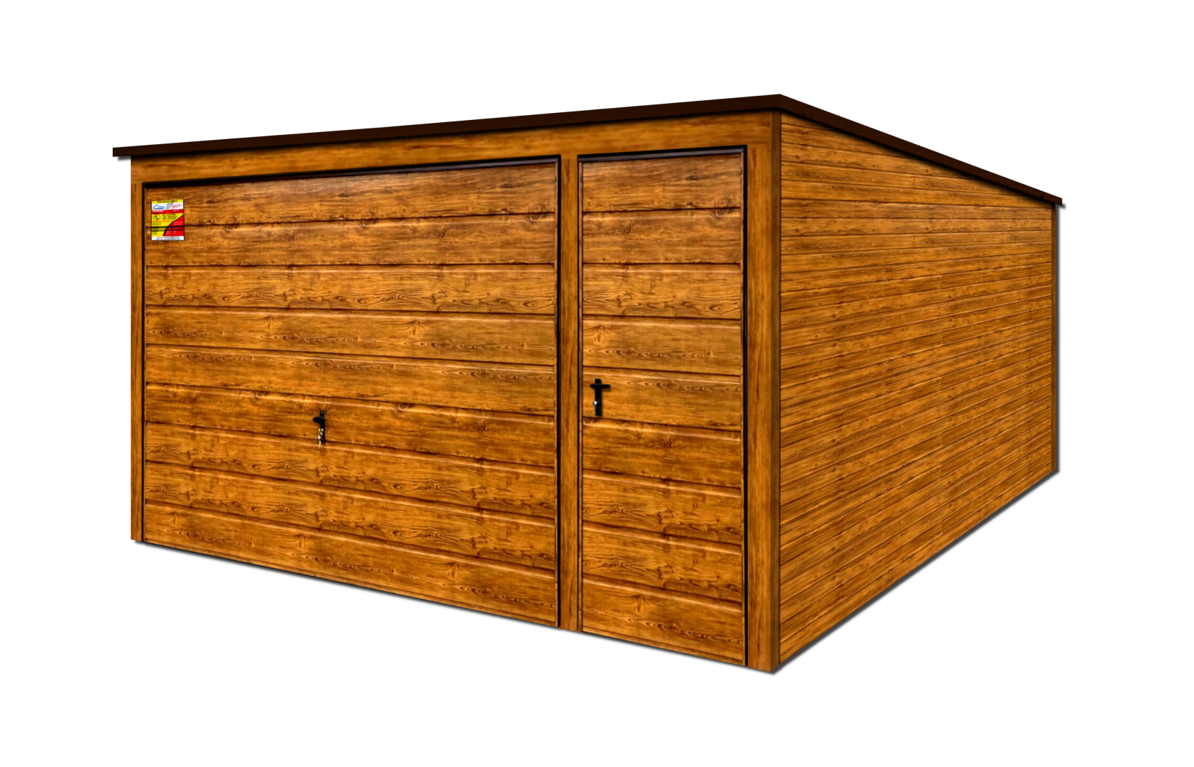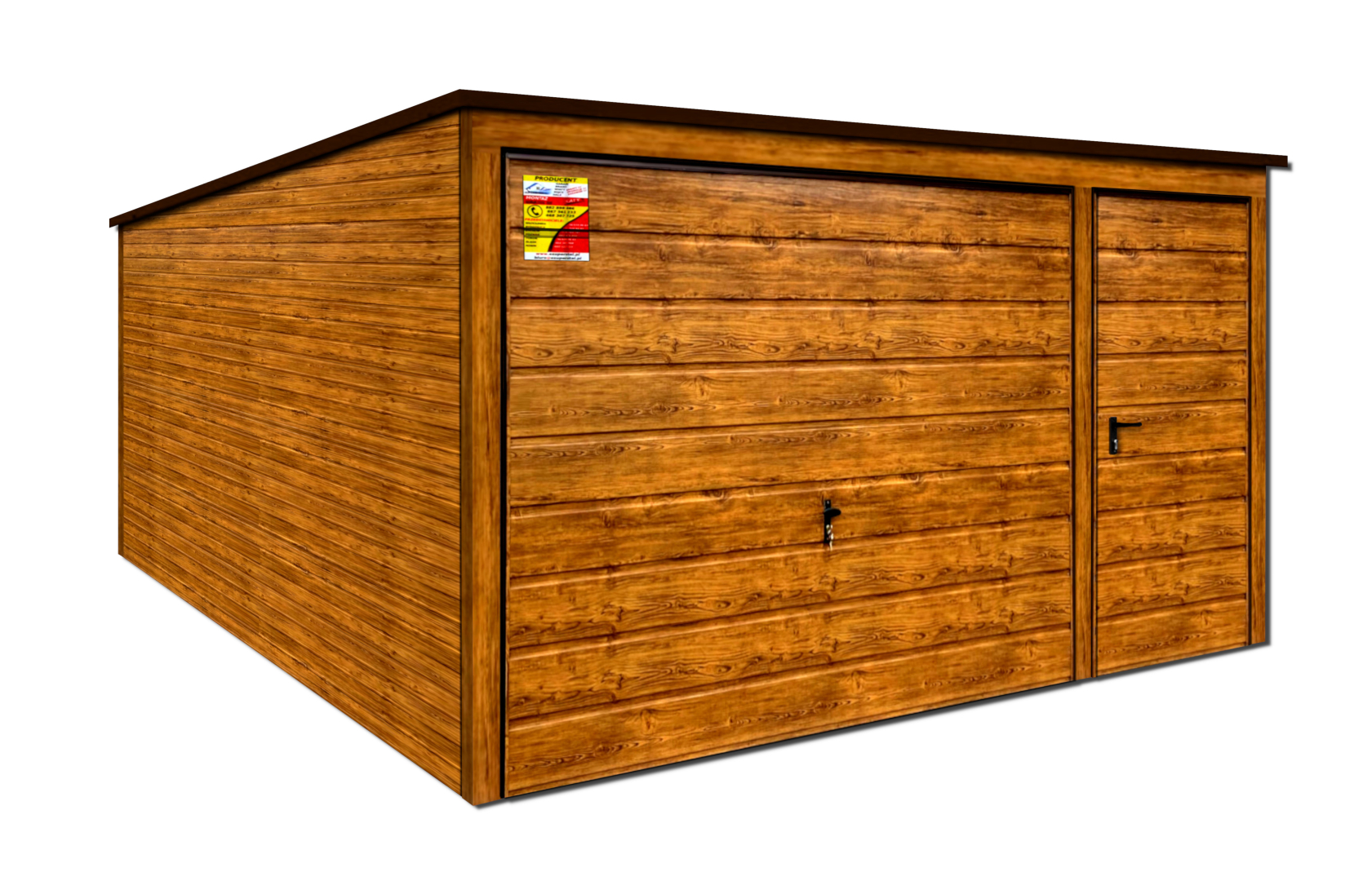 Garaż blaszany 4X4 PREMIUM – Spad dachu do tyłu, brama uchylna, drzwi, okucia blacharskie, profil zamknięty