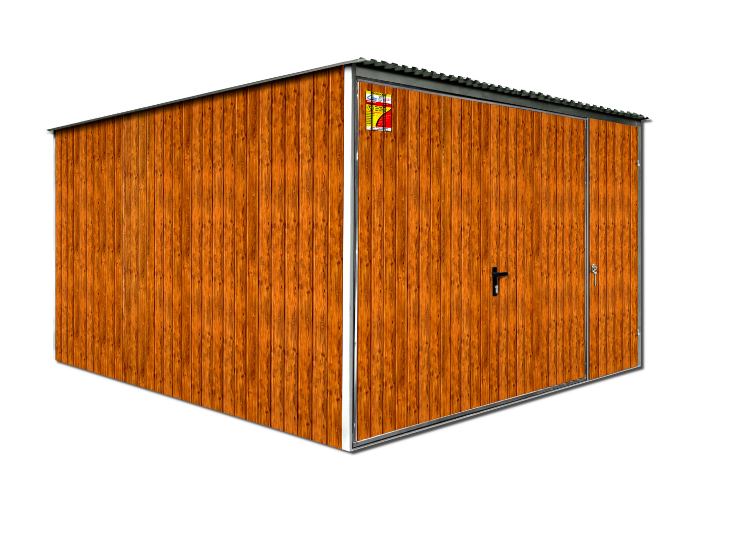 GARAŻ BLASZANY DREWNOPODOBNY 4X4 – SPAD DACHU DO TYŁU, BRAMA UCHYLNA, DRZWI, KONSTRUKCJA OCYNKOWANA
