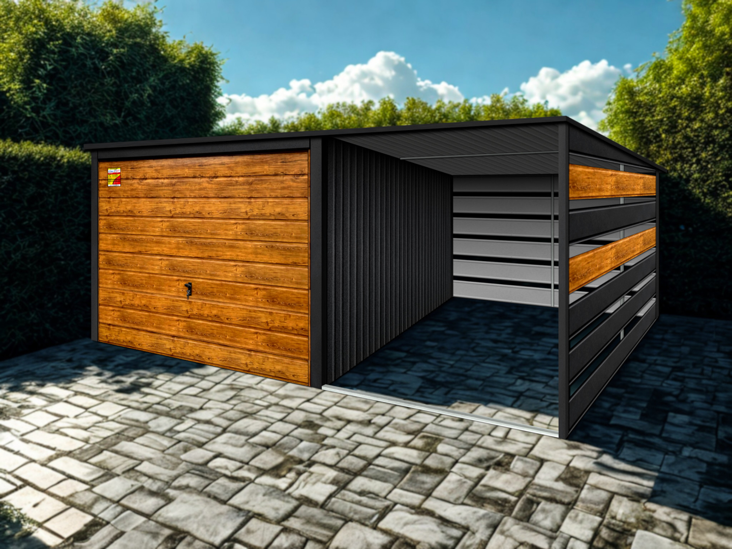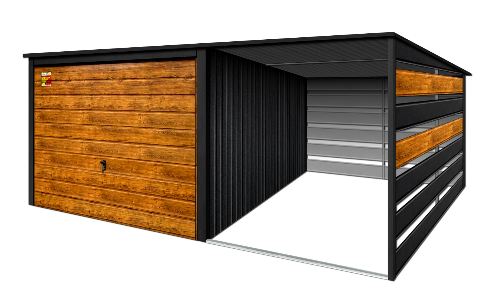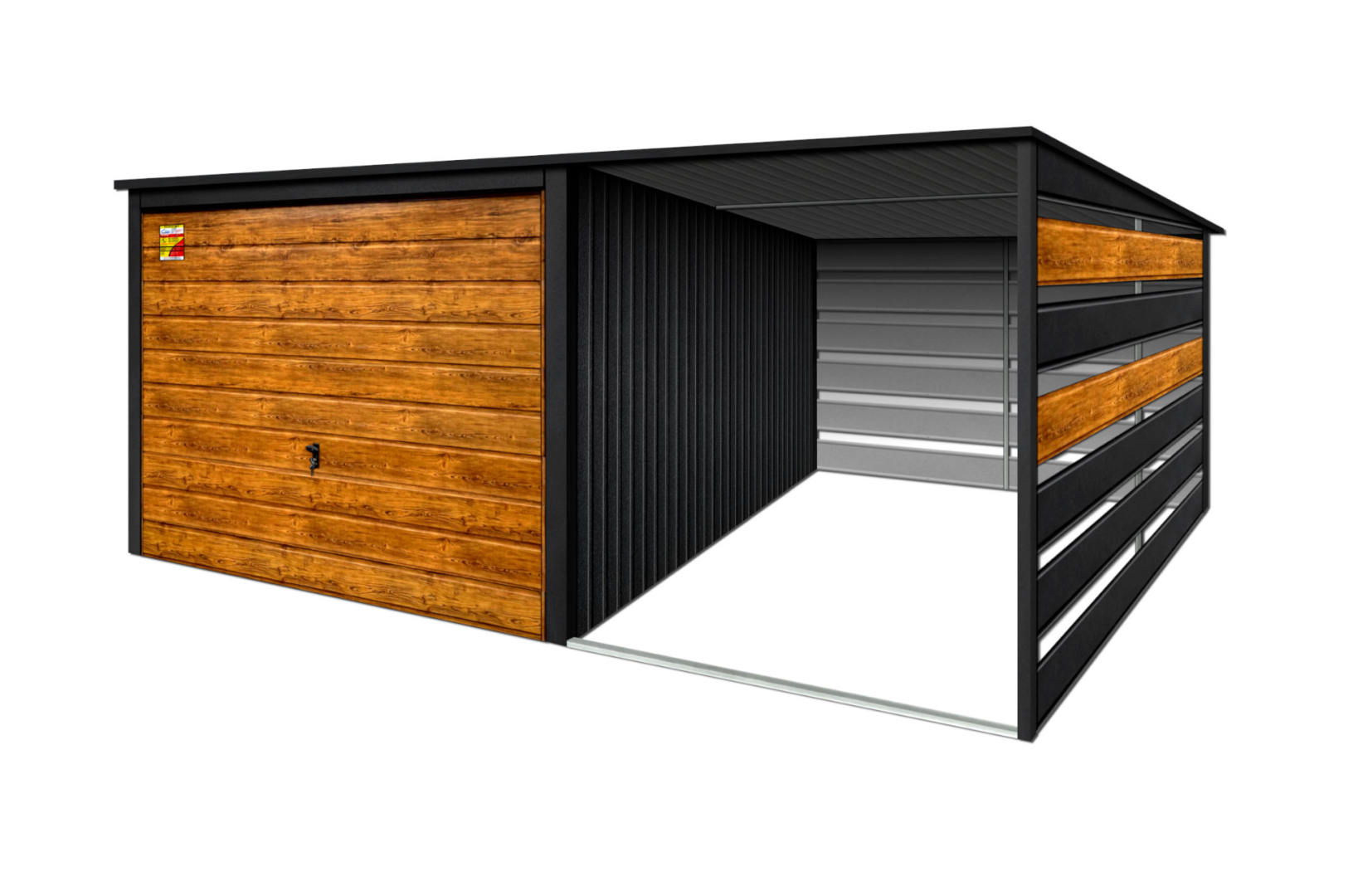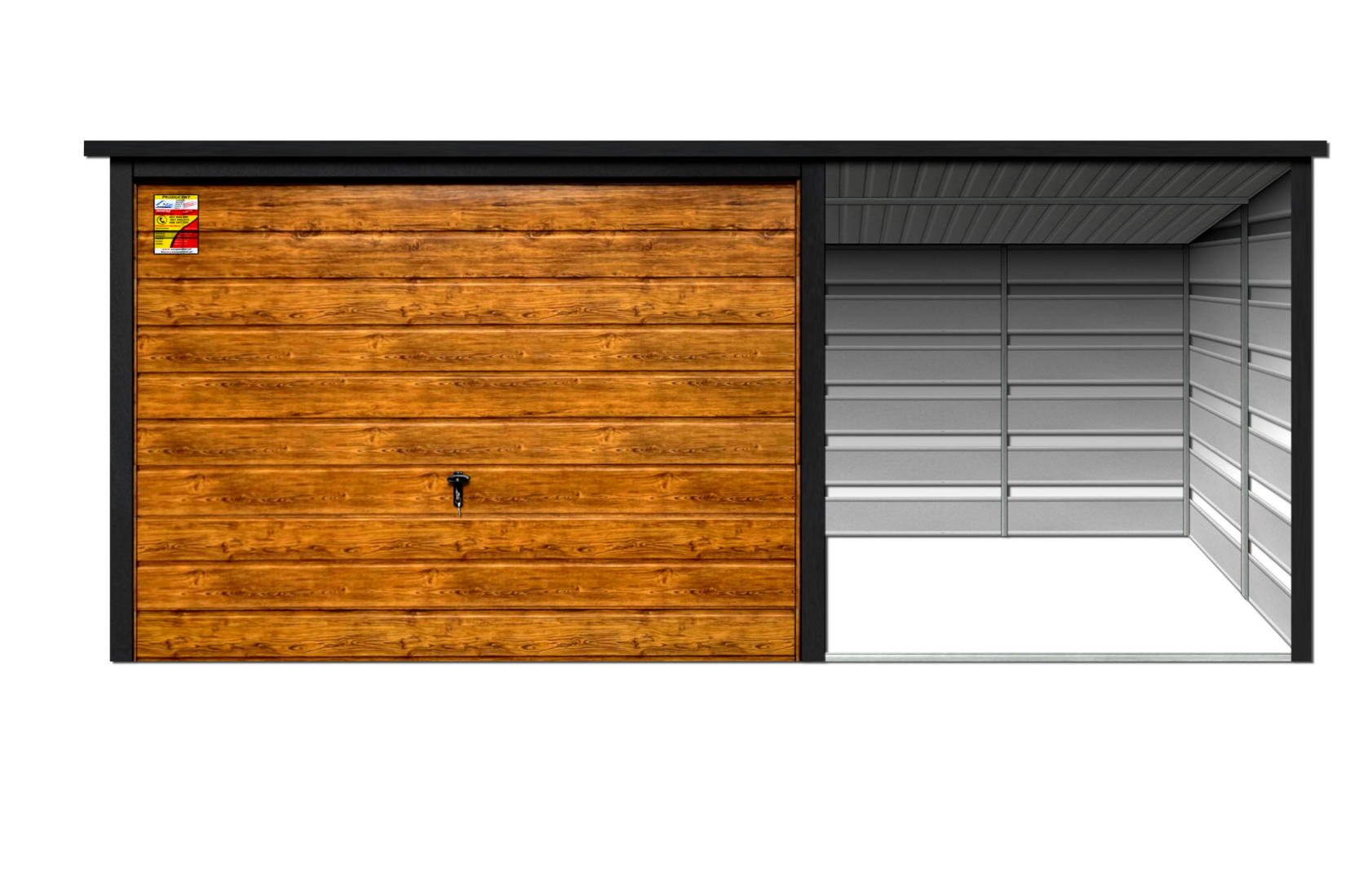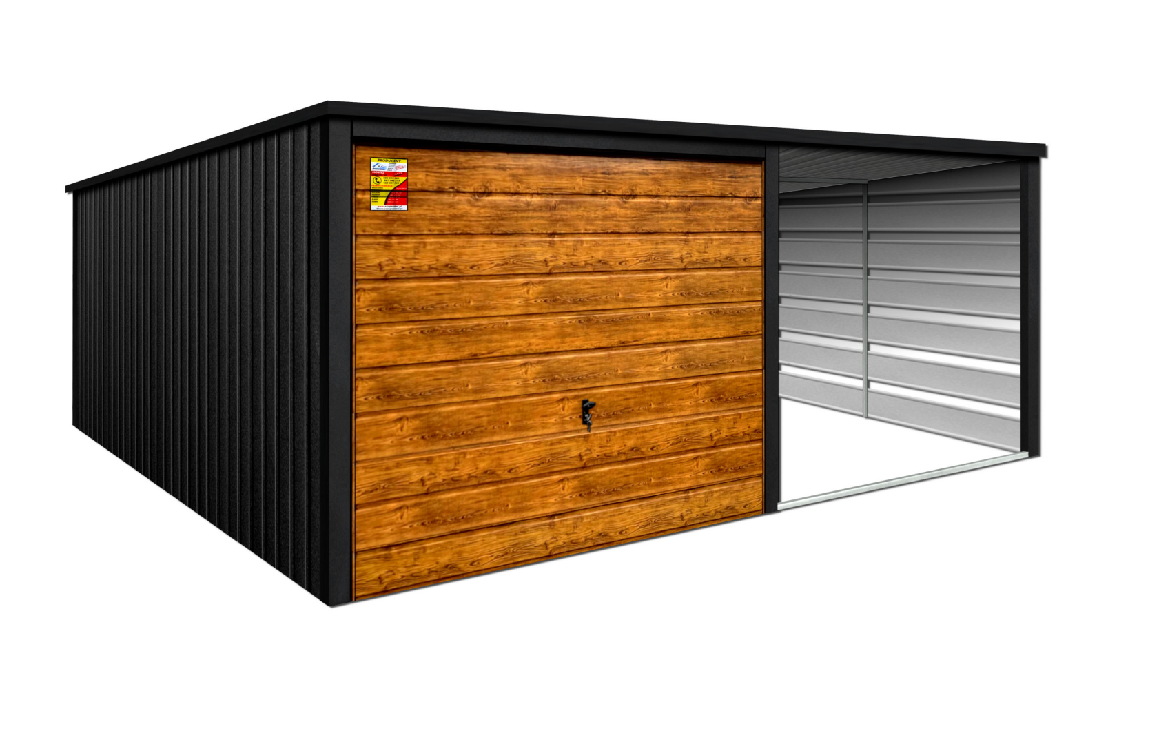 GARAŻ LUX 4X8 Z WIATĄ SMK – SPAD DACHU DO TYŁU, BRAMA UCHYLNA SOSNA, OKUCIA BLACHARSKIE DACHU I NAROŻNIKÓW