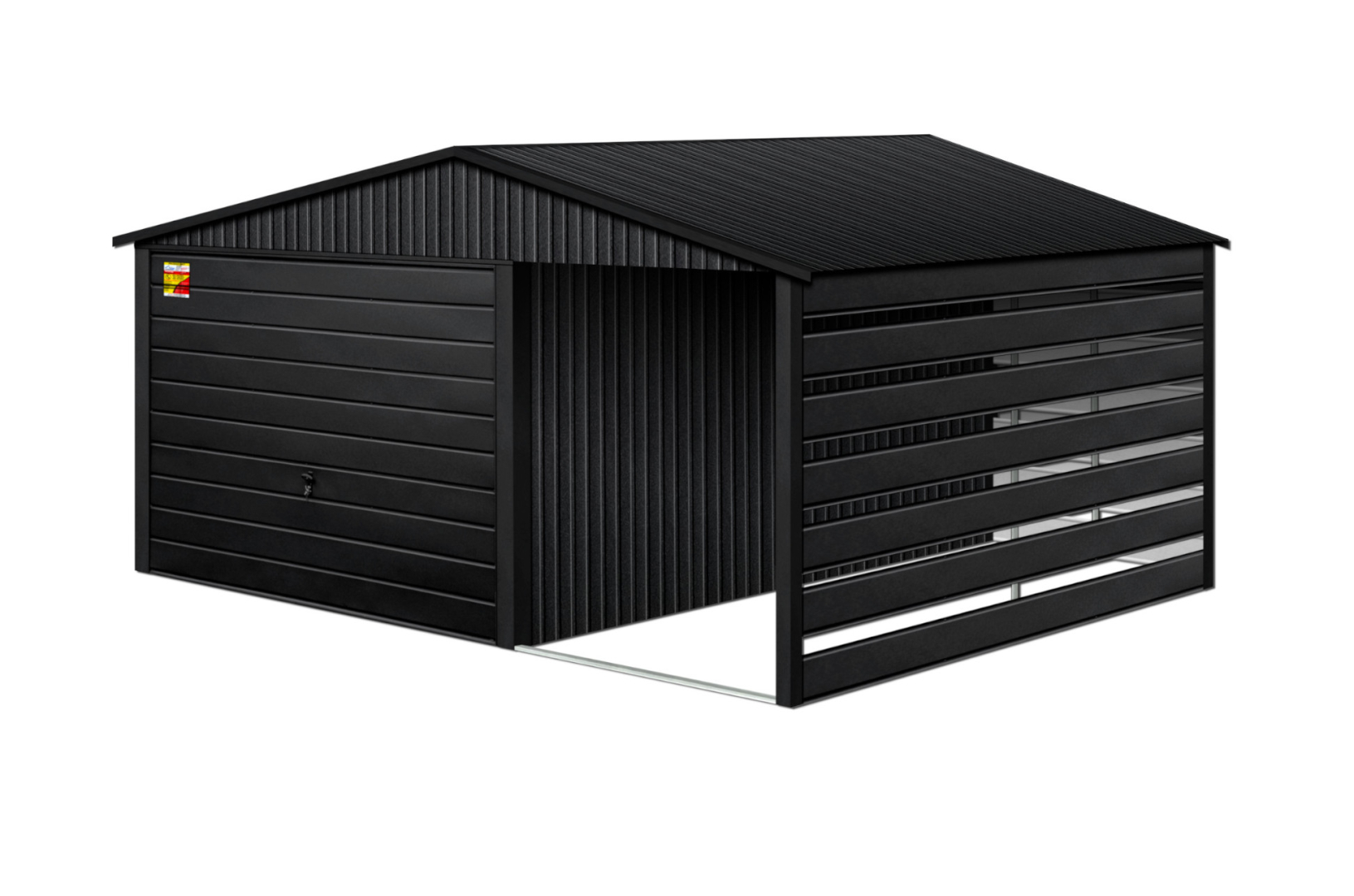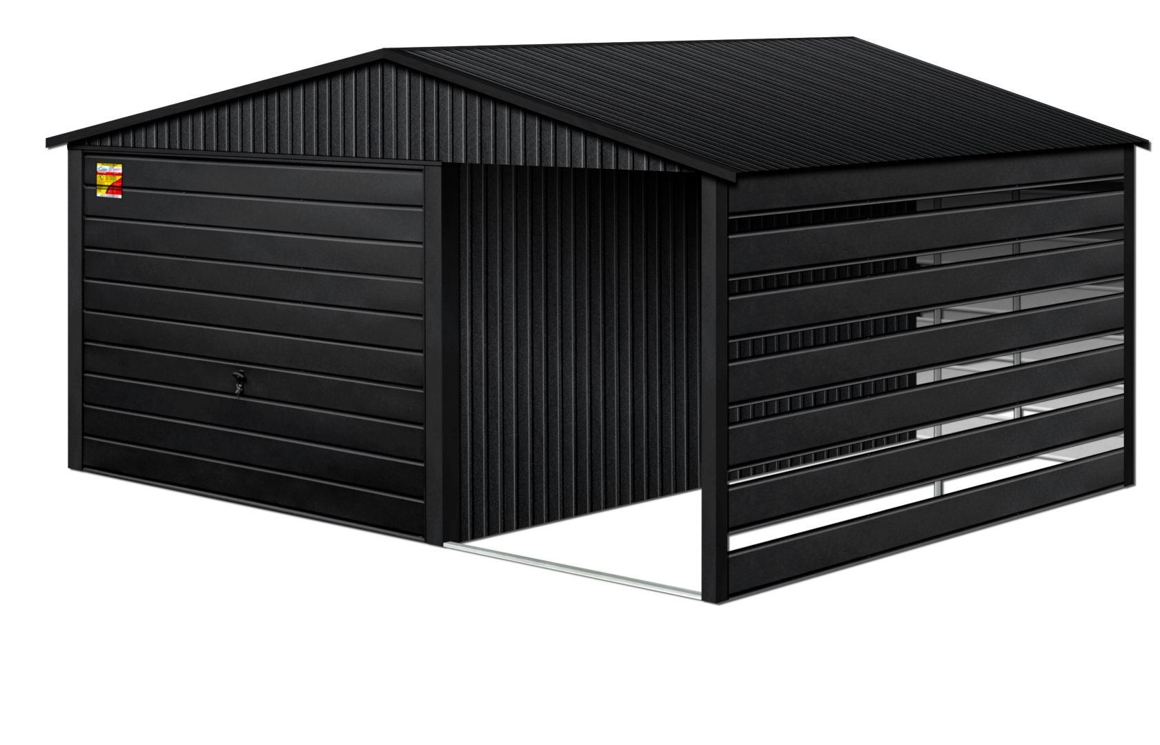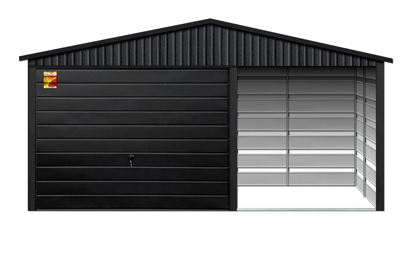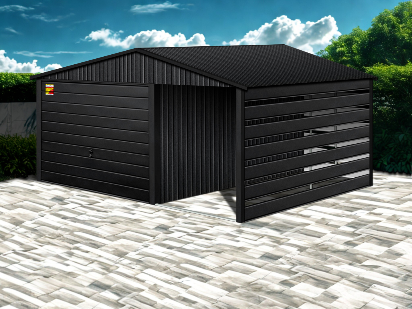 Odtwarzacz jest praktycznym garażem blaszanym z serii LUX, wzbogacony w dobudowaną światę, wykonaną w dodatkowym Systemie SMK! szerokość 5m (garaż 3m + świat 2m) - długość 6m - dwuspadowy dach - wysokość