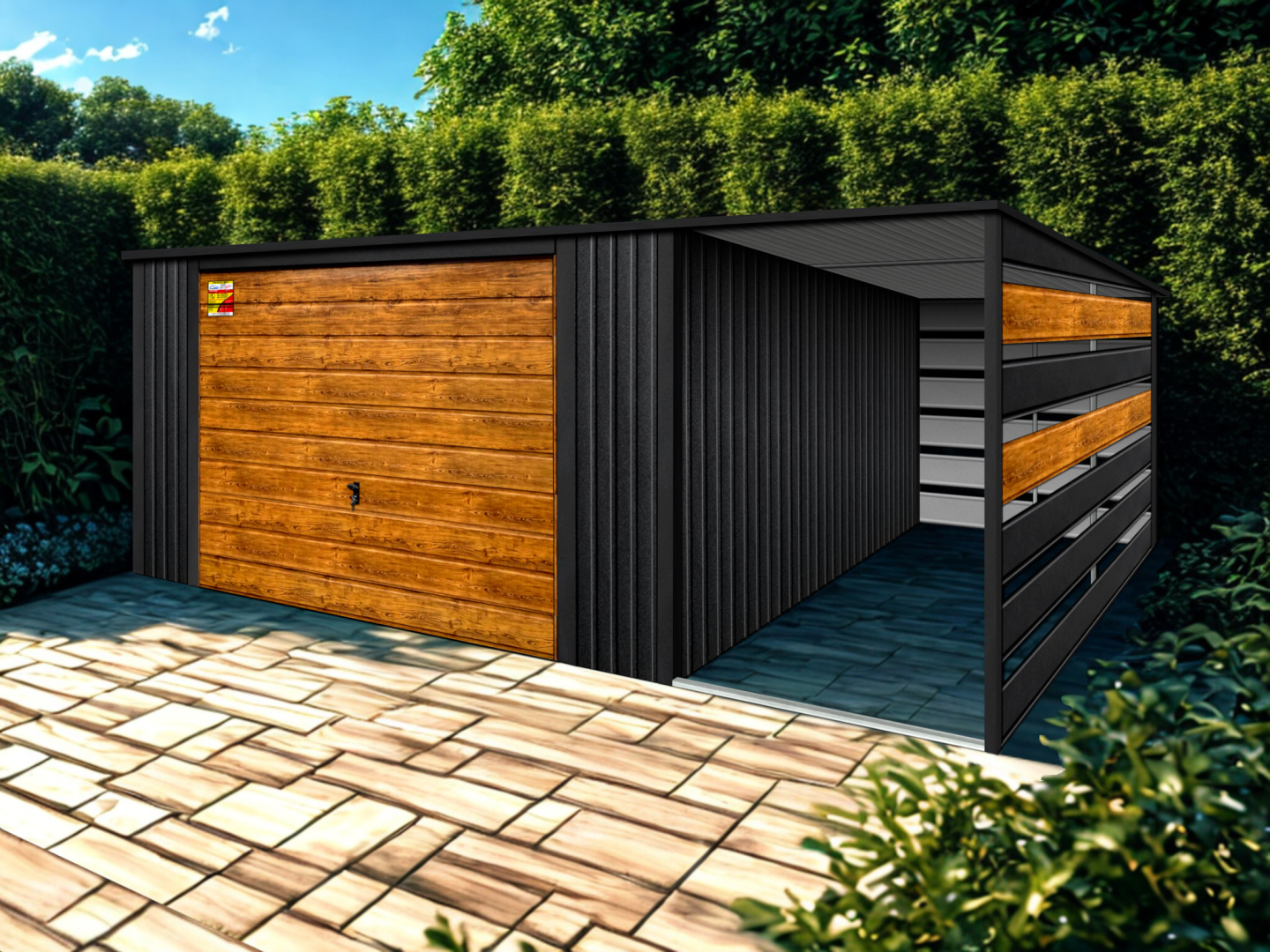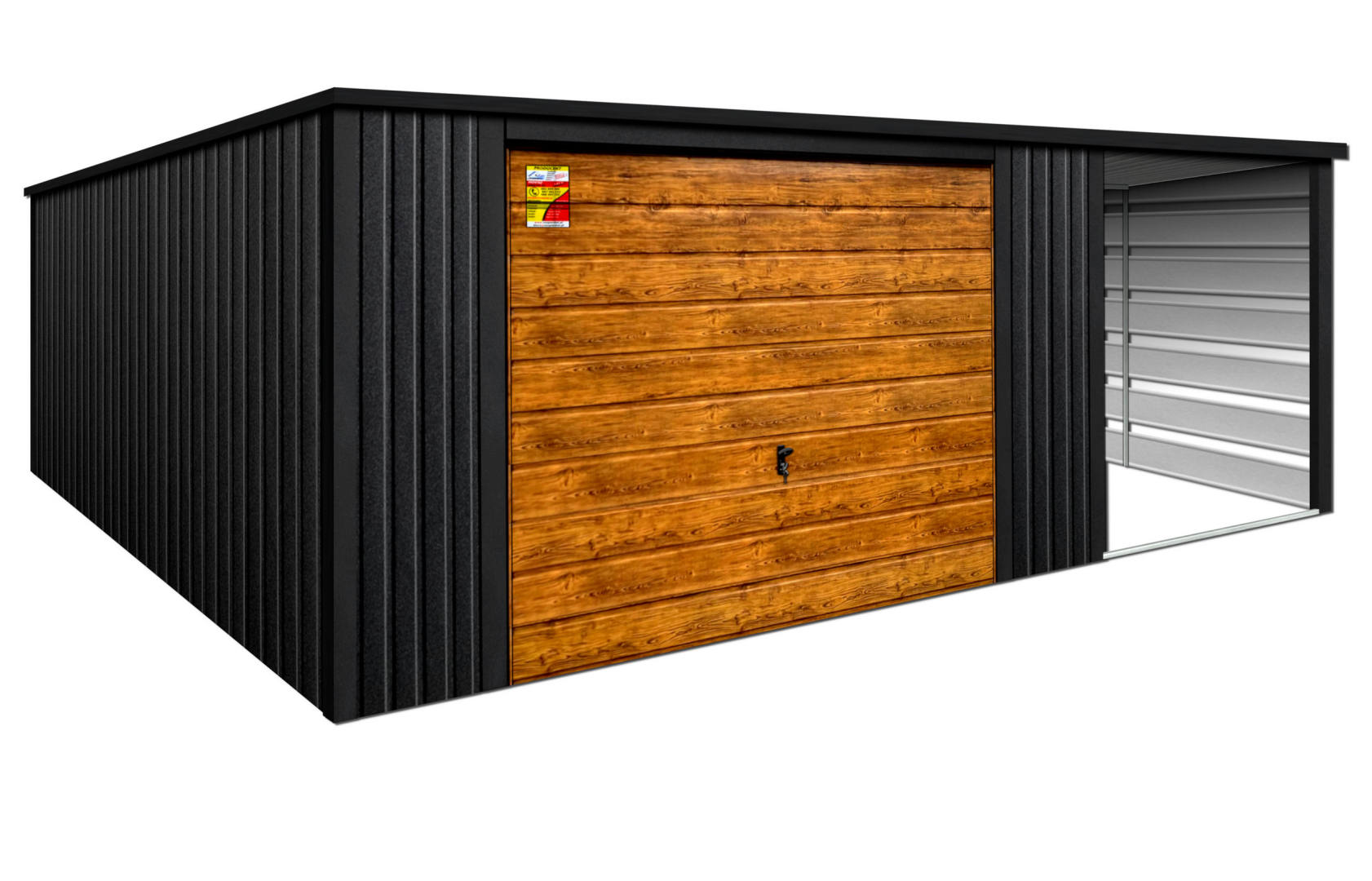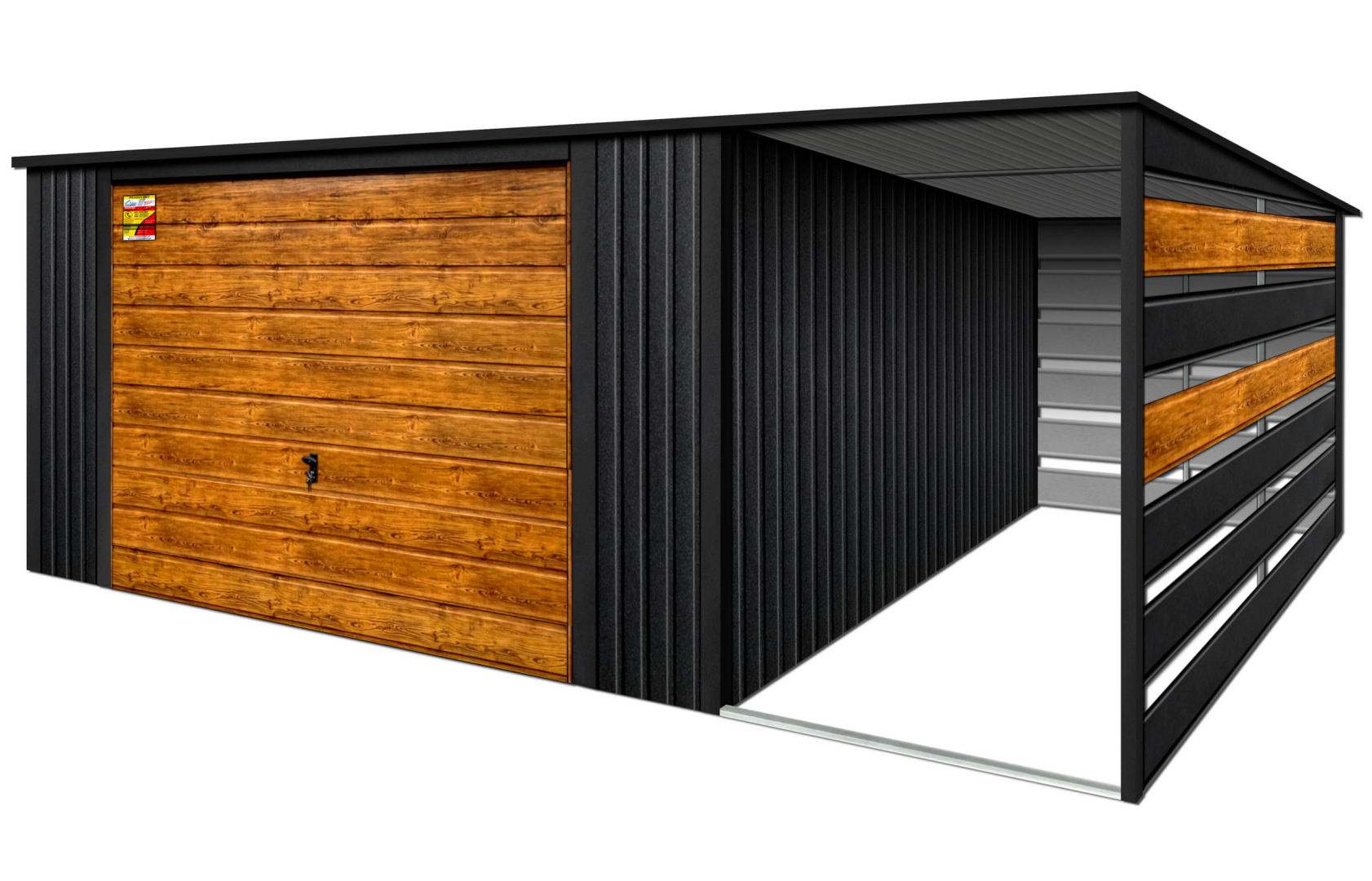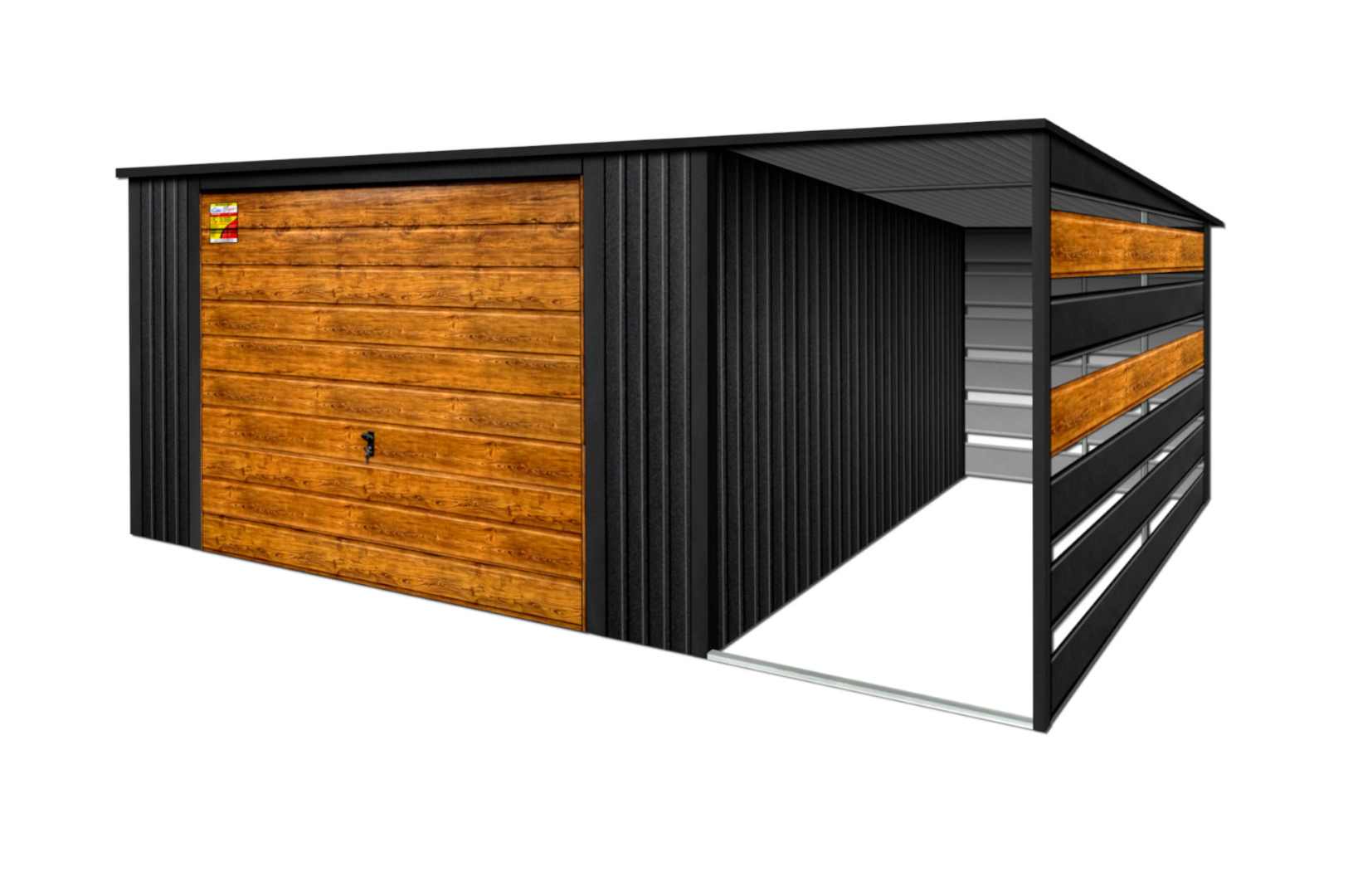 GARAŻ LUX 7X8 Z WIATĄ SMK – SPAD DACHU DO TYŁU, BRAMA UCHYLNA SOSNA, OKUCIA BLACHARSKIE DACHU I NAROŻNIKÓW