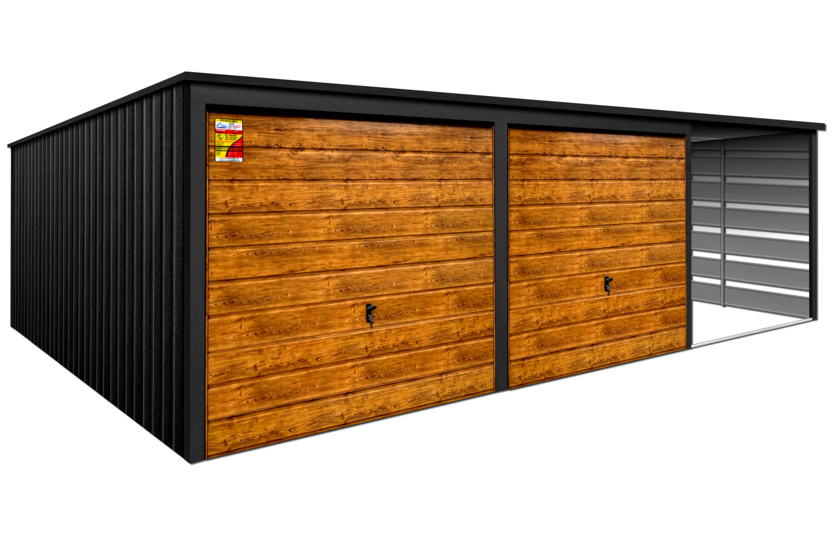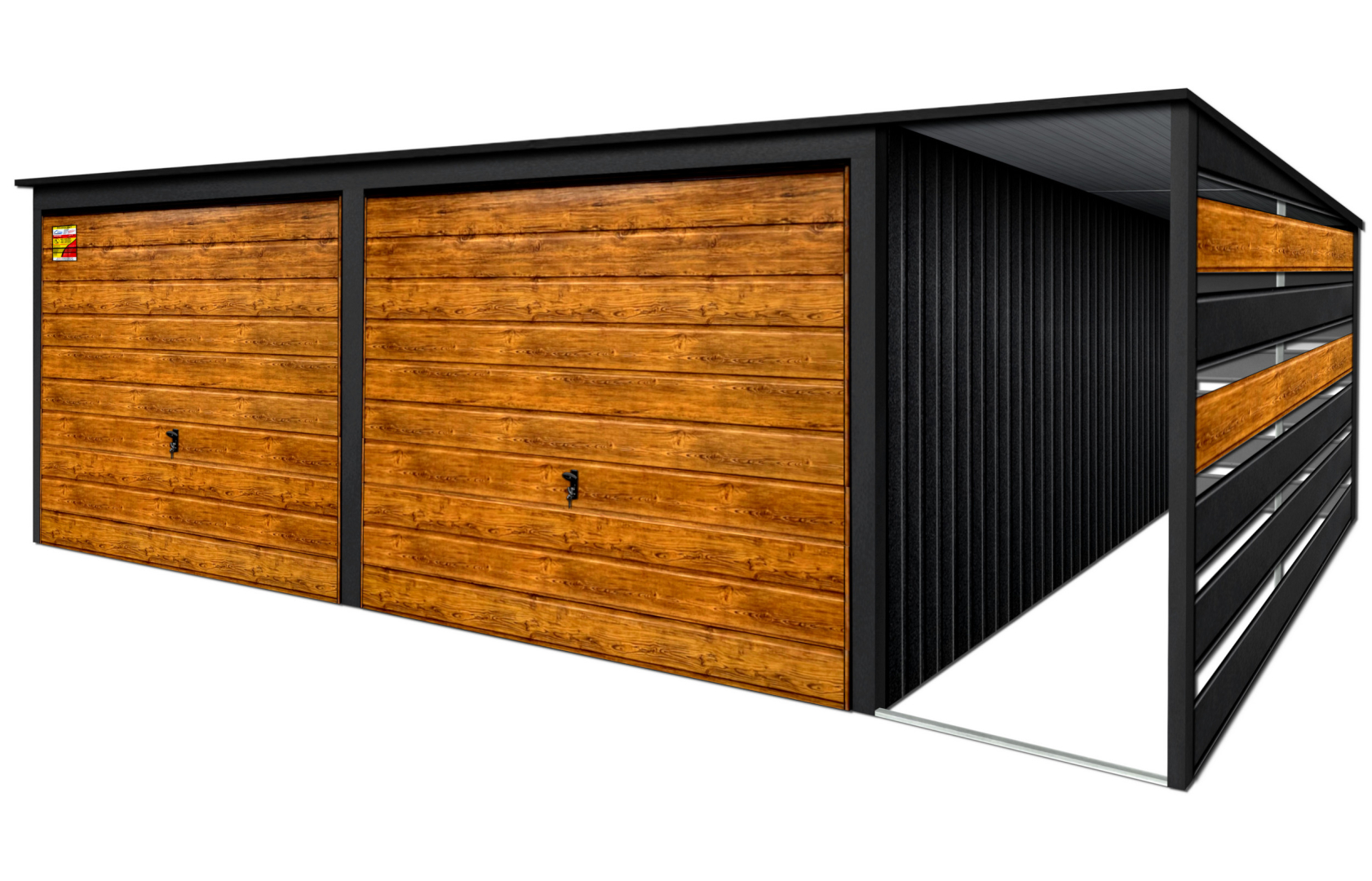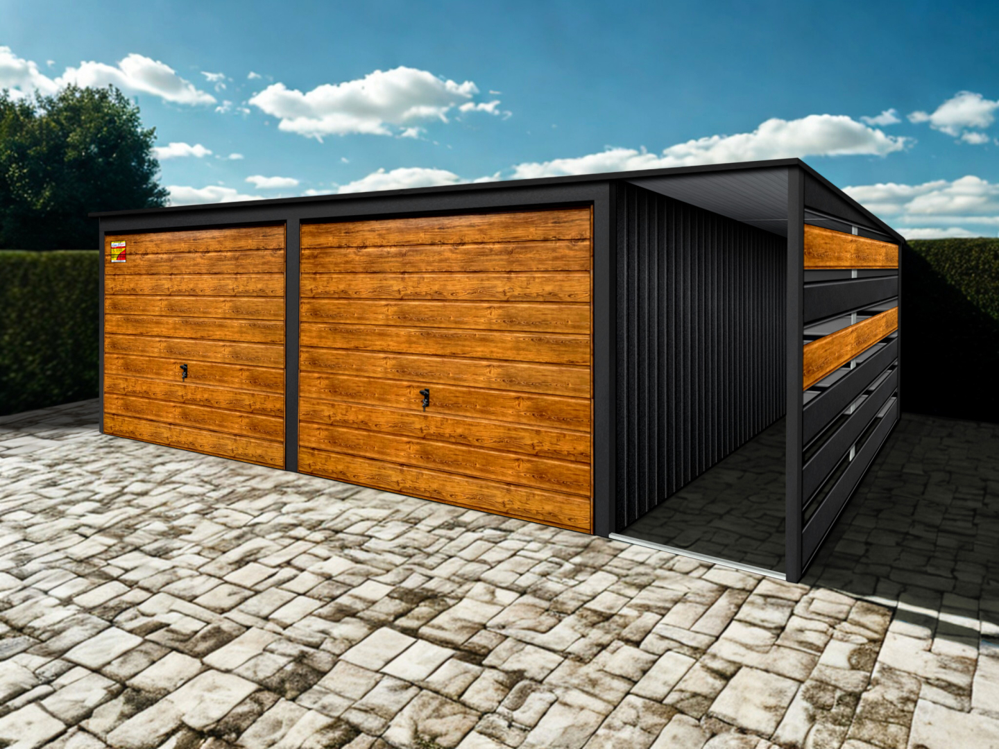 GARAŻ LUX 8X8 Z WIATĄ SMK – SPAD DACHU DO TYŁU, BRAMY UCHYLNE SOSNA, OKUCIA BLACHARSKIE DACHU I NAROŻNIKÓW